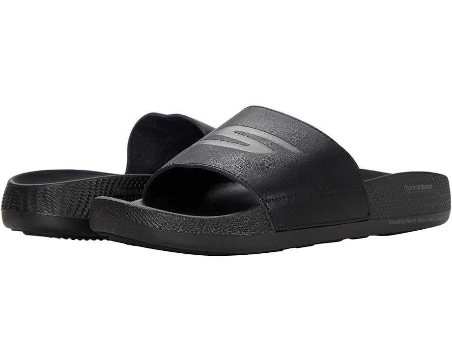 The SKECHERS® Go Hyper Slide sandal offers comfort and athletic-inspired style with an easy slip-on construction, open toe, and premium cushioning.SKU: #9462088Leather upper features a smooth finish.Signature logo accent at the vamp strap.Smooth leather and synthetic lining.Contoured footbed provides long-lasting comfort.Lightweight, highly responsive HYPER BURST™ foam cushioned midsole.Goodyear® rubber traction outsole provides durability, traction, and a smooth transition.Imported.Product measurements were taken using size 9, width D – Medium. Please note that measurements may vary by size.Measurements: