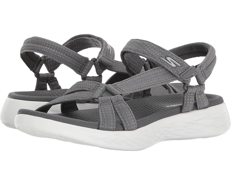 The SKECHERS® On the GO 600 – Brilliancy sandal offers sporty style and premium comfort with a pique textured mesh fabric upper, open toe, and machine washable design.SKU: #9010869Instep strap with adjustable hook-and-loop closure.Double slide straps at front with side loop join.Padded heel strap.Features high-rebound cushioning with responsive feedback.Signature logo accent at the instep strap.Soft fabric strap lining.GOga Max® footbed technology for long-lasting comfort.5GEN® midsole features a proprietary lightweight injection-molded compound with memory retention that helps absorb impact.Independent GOimpulse and integrated Goga Pillars® sensors offer flexibility and feedback for a more responsive walking experience than ever before.Goga Pillars® technology on midsole and outsole.Multi-directional traction outsole.Imported.Product measurements were taken using size 9, width B – Medium. Please note that measurements may vary by size.Measurements: