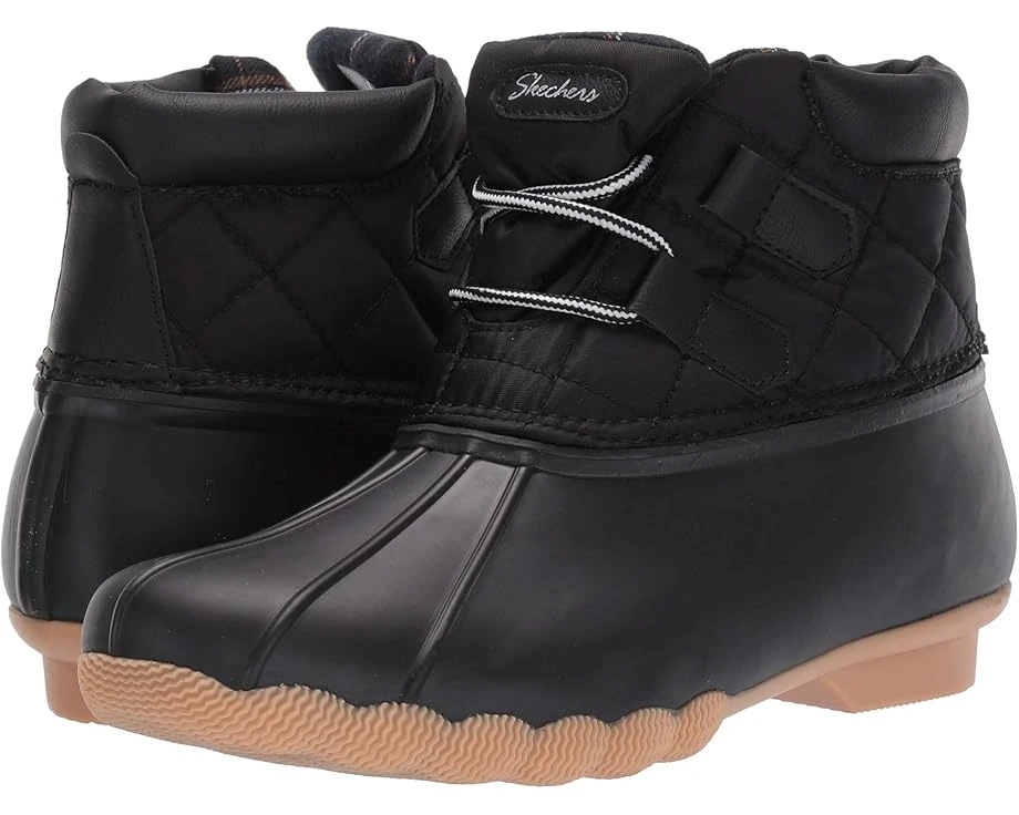 With comfort features, a mixed texture finish, and a duck boot silhouette, the SKECHERS® Pond boot is a must-have style for the cold-weather season.SKU: #9282611Waterproof seam-sealed rubber shell upper.Fabric upper treated with 3M Scotchgard™ to resist water and stains.Lace-up design offers a secure fit.Round toe boasts raised, sculpted detailing.Water-resistant parka nylon fabric collar flaunts a quilted finish.Padded tongue and collar.Plaid flannel insulated shaft for added warmth.Signature logo accent at the tongue.Breathable fabric lining.Warm Tech Memory Foam™ cushioned insole for all-day comfort.Contrasting, high-traction rubber outsole. Imported.Product measurements were taken using size 8, width B – Medium. Please note that measurements may vary by size.Weight of footwear is based on a single item, not a pair.Measurements: