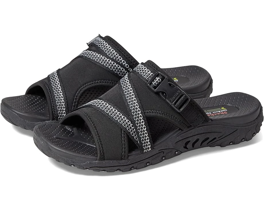 Enjoy endless comfort and flexibility as you walk down the streets or the trails wearing the SKECHERS® Reggae – Slide Thru Sandals.SKU: #9855134Soft neoprene fabric upper with webbing strap.Nylon fabric lining.Contoured cushioned EVA footbed.Slip-on style with an adjustable buckle on the strap.Open toe design.EVA midsole offers extra cushioning comfort.Flexible rubber traction outsole.Imported.