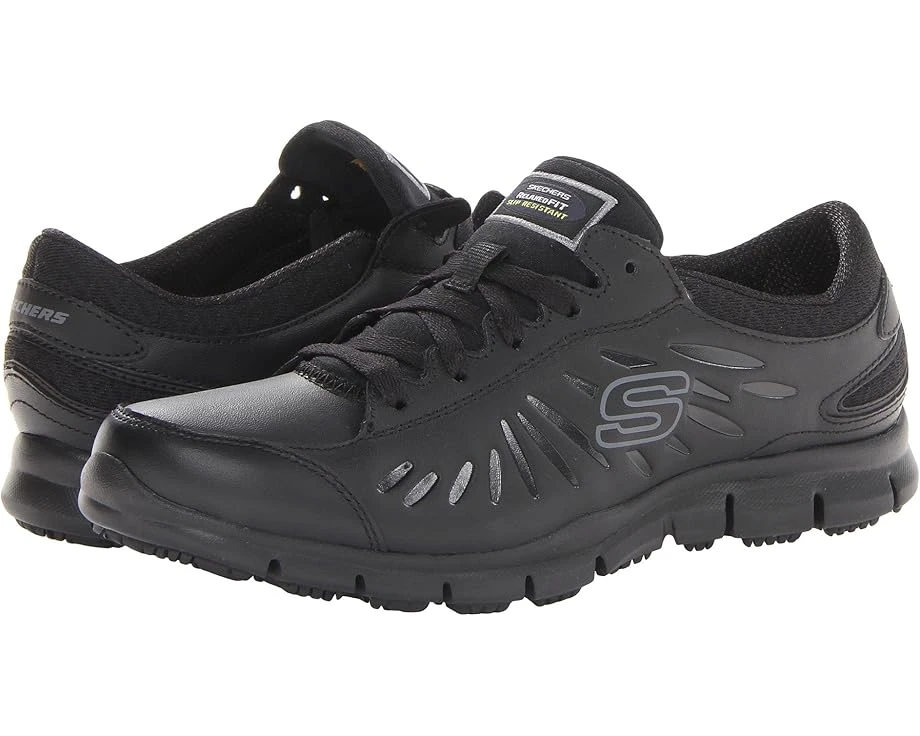 Keep a pep in your step all day with the comfortable SKECHERS® Work Eldred!SKU: #8322496Lace up sporty casual work sneaker features the Relaxed Fit® design for a roomier, more comfortable fit and Memory Foam cushioning.Soft toe meets ASTM F2892 Electrical Hazard (EH) safety standards.Smooth leather upper.Padded collar and tongue.Stretch fabric joined center tongue panel for added comfort.Mesh fabric collar and heel panel for cooling effect.Printed reflective matching color side stripe accents.Stitching accents.Side “S” logo.Lightweight flexible shock absorbing midsole.Removable insole topped with Memory Foam for incredible all-day cushioned comfort. Soft fabric shoe lining.Slip-resistant nitrile rubber traction outsole meets ASTM F2913-19 safety standard.Imported.Product measurements were taken using size 7.5, width B – Medium. Please note that measurements may vary by size.Weight of footwear is based on a single item, not a pair.Measurements: