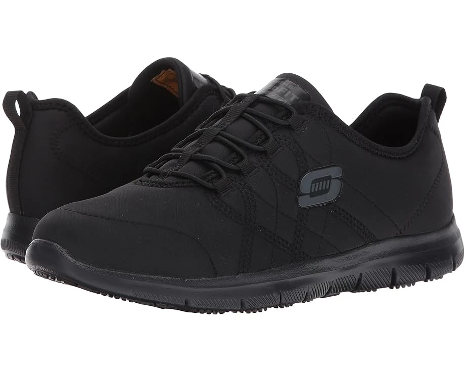 Enjoy your whole day in sporty style and surefooted comfort with the Ghenter – Srelt from Skechers Work®. SKU: #8921638Casual work sneaker features the Relaxed Fit® design for a roomier, more comfortable fit and Air-Cooled Memory Foam cushioning.Soft toe construction.Soft heathered jersey knit fabric upper with water-resistant protection.Bungee stretch lacing for secure lacing or easy slip-on options. Padded collar and tongue for added comfort. Signature stitching accents and side S logo.Rubber toe guard provides added protection against abrasions. Heel panel fabric overlay with pull on top tab.Side gore panels for excellent flexibility and easy on and off.Soft fabric lining offers added comfort.Comfortable footbed with Air-Cooled Memory Foam cushioning for incredible all-day cushioned comfort.Flexible, lightweight midsole provides excellent shock absorption. Flexible rubber, slip-resistant outsole with traction design meets ASTM F2913-19 safety standard.Imported.Product measurements were taken using size 7.5, width B – Medium. Please note that measurements may vary by size.Measurements: