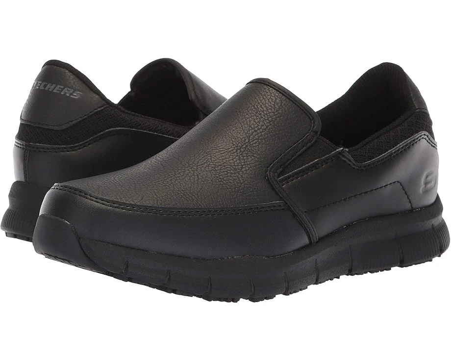 The Skechers® Work Nampa – Annod slip-on work shoe makes sure you get in a good day’s work every day with its tough yet comfortable design.SKU: #9154531Style number: 77236. Sporty work shoe features the Relaxed Fit® design for a roomier, more comfortable fit and Memory Foam cushioning.Leather-textured faux-leather upper.Synthetic overlays at toe, sides, and heel for added durability.Padded collar and tongue for added comfort.Breathable fabric lining offers a great in-shoe feel. Features cushioned Memory Foam for incredible underfoot support and breathable comfort. Flexible lightweight shock-absorbing midsole.Durable rubber outsole is slip resistant. Sole tested using F1677-2005 Mark II standards to meet or exceed a .5 coefficient even on wet and oily surfaces.Electrical Hazard (EH) meets F2892-11 safety standards.Imported. Product measurements were taken using size 7.5, width B – Medium. Please note that measurements may vary by size.Measurements:
