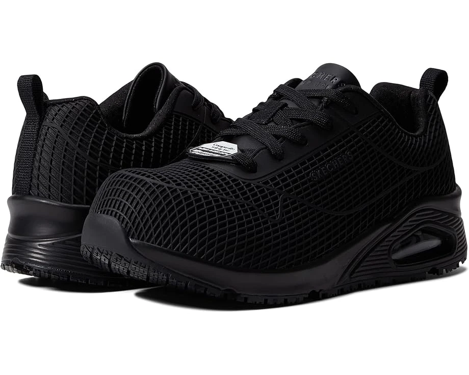 Featuring a well-designed look, the SKECHERS® Uno SR Composite Toe safety shoes help you stay busy, and safer, in slippery or wet workplaces.SKU: #9554457Breathable synthetic mesh and soft textile upper.Lace-up closure.Pull tab on the back for easy on/off.Skech-Air® air-cushioned midsole.Air-Cooled Memory Foam® insole.Composite toe rated ASTM F2412/2413-2011 I/75 C/75, ASTM F2413-05 Electrical Hazard (EH).Oil and slip-resistant outsole with traction design meets ASTM F2913-19 safety standard.Imported.Product measurements were taken using size 9, width B – Medium. Please note that measurements may vary by size.Measurements: