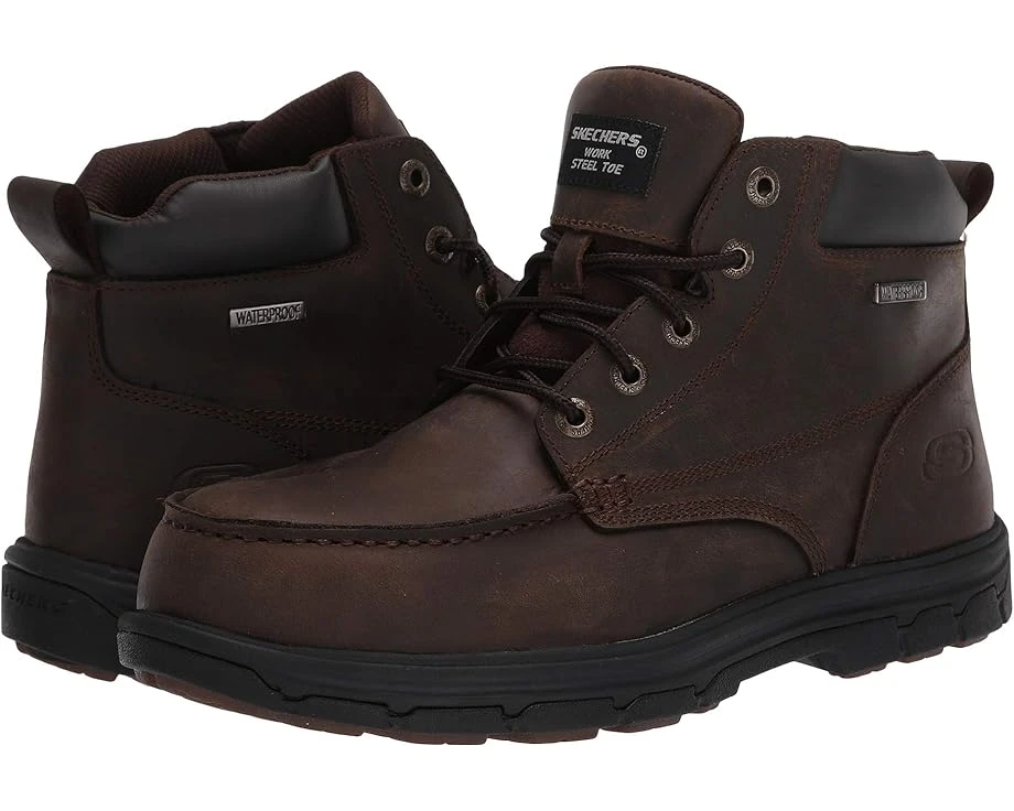 Keep comfortable while you’re putting in work with the SKECHERS® Work Relaxed Fit® Vicksburk – Gentain Waterproof Work Boots. These steel-toe work boots pair essential waterproof, Electrical Hazard Safe protection with shock-absorbing comfort and a spacious fit to keep you comfortable until clock-out.SKU: #9376611Lace-up work boot features steel safety toe meets ASTM 2412/2413-2011 I/75 C/75, EH (electrical hazard) standards.Relaxed Fit moc-toe work boots provide a roomy, spacious fit for all-day comfort.Oiled leather upper provides fully waterproof performance with sealed inner seams.Cushioned tongue and collar with leather pull-loop at back.Soft, breathable fabric lining.Integrated Memory Foam insole cushions and stabilizes.EVA midsole absorbs shock from foot strikes.Rubber outsole with traction for uneven terrain.Imported.This outsole meets ASTM F2913 Slip Resistant Safety Standards under Wet/Dry conditions only.